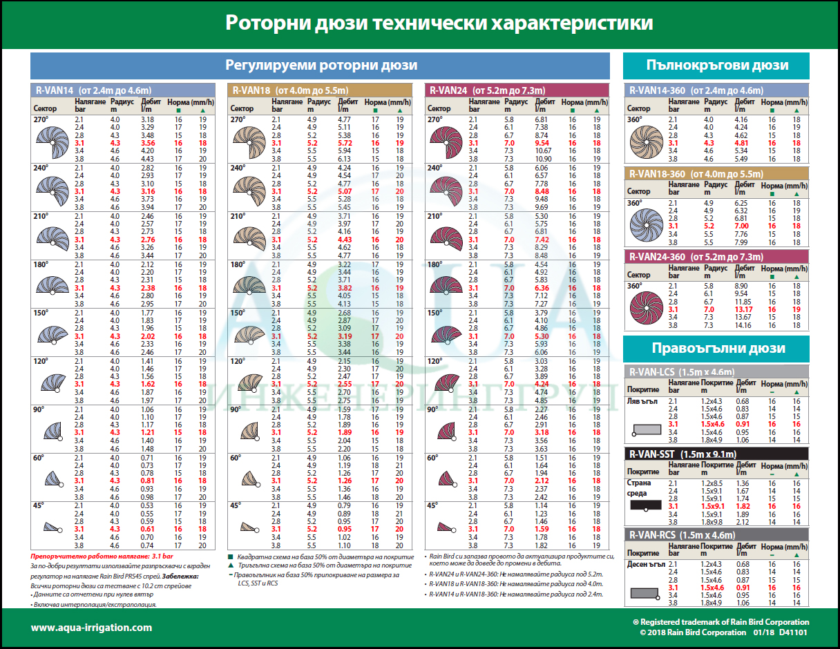 R-VAN притежават плътни водни струи с големи водни капчици прорязващи вятъра, за да доставят вода, където искате. R-VAN се използват по-лесно благодарение на ръчно регулируемият сектор и радиус. R-VAN са с 23% ценово предимство и изискват малки складови наличности, за да постигнат покритие от 45 ° до 360 ° спрямо водещата конкурентна марка.