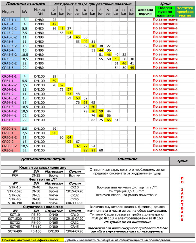 - Grundfos CR помпи с високо ефективен клас мотори EFF1- IP55, 3Ph, 400V, 50Hz, 2950 RPM.
