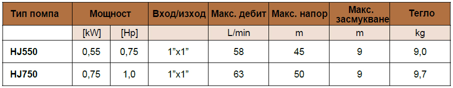 Самозасмукващи хоризонтални центробежни помпи вклюват два модела: HJ550 и HJ750, както и техните съответстващи мотори. Диапазонът е специално проектиран да посрещне: