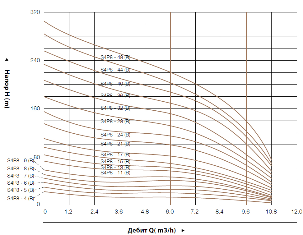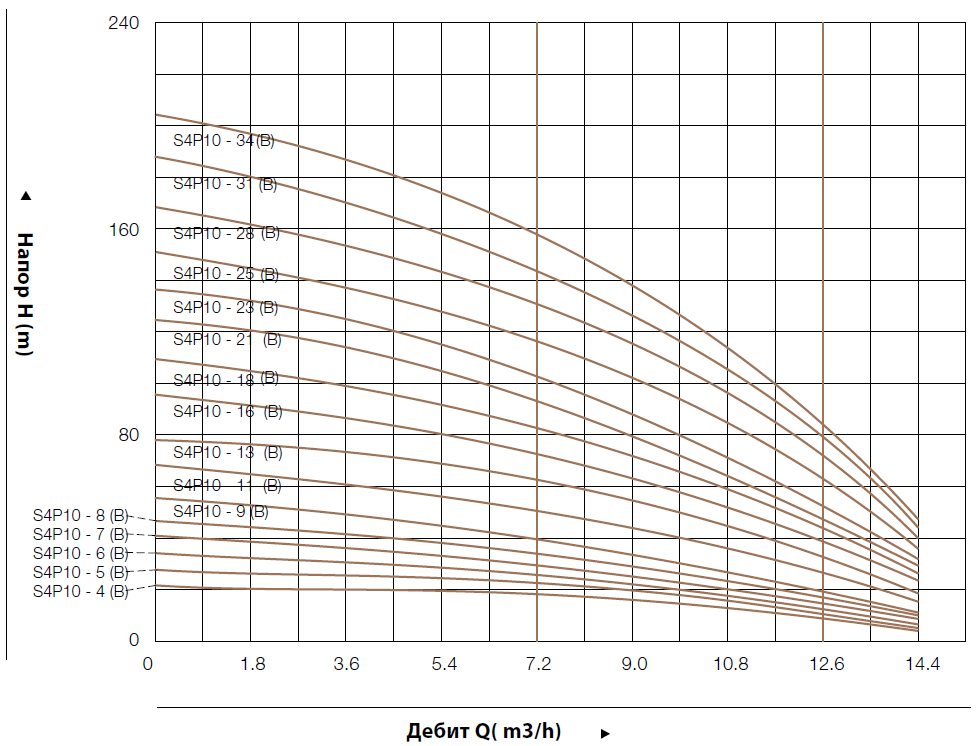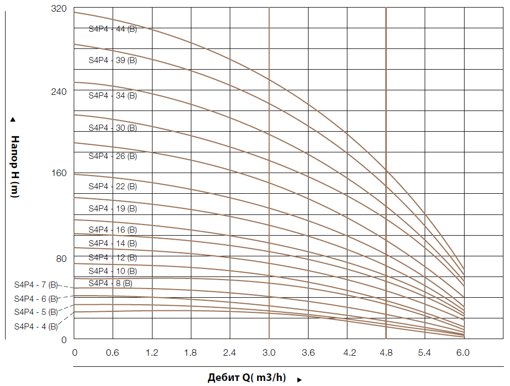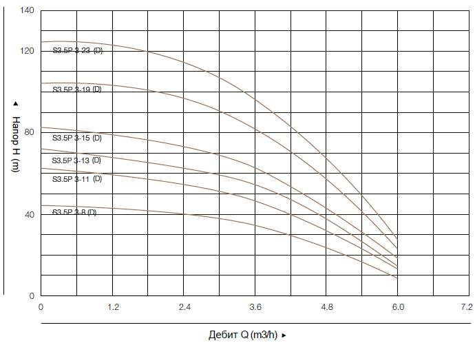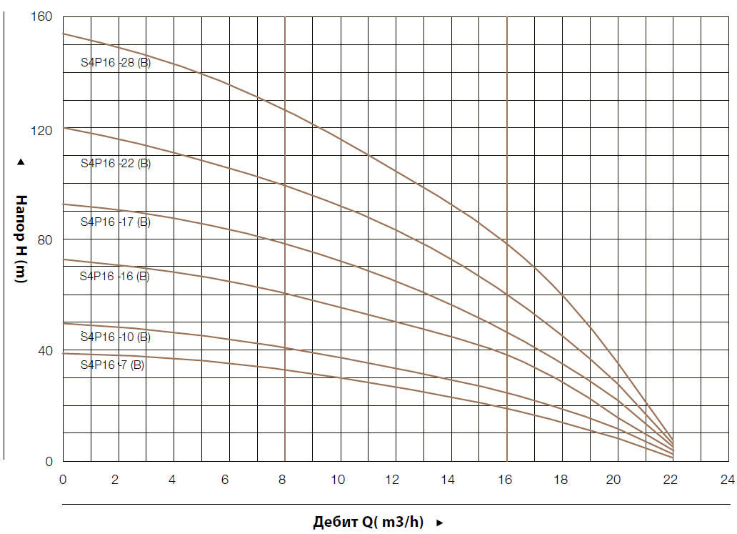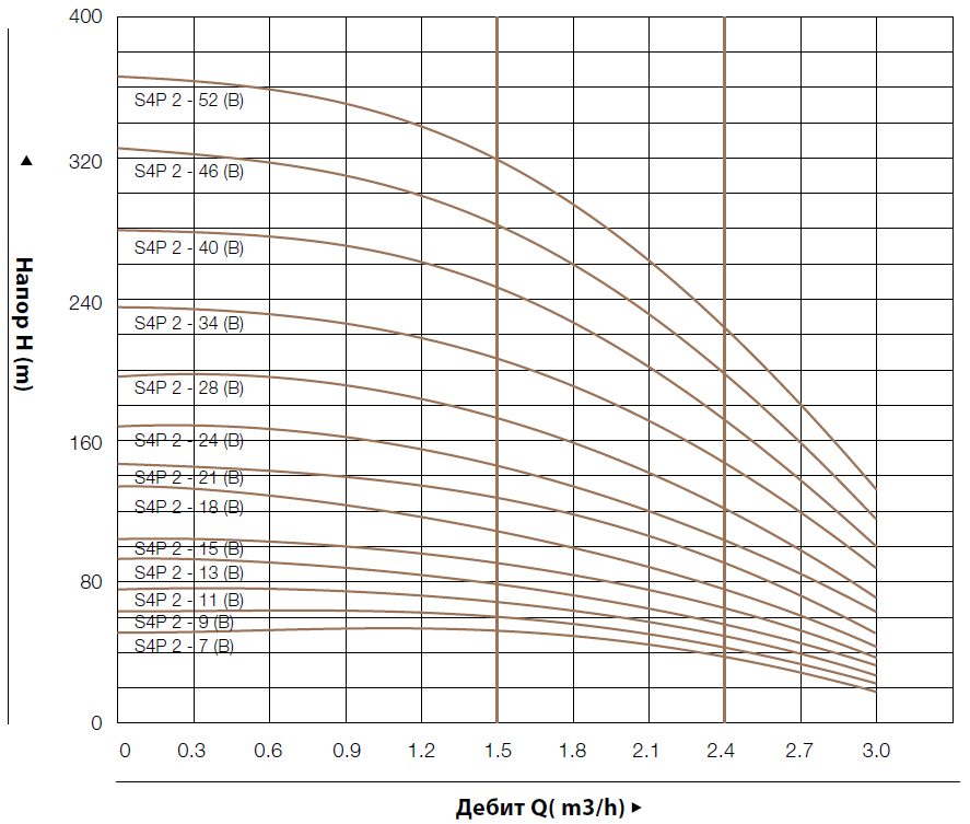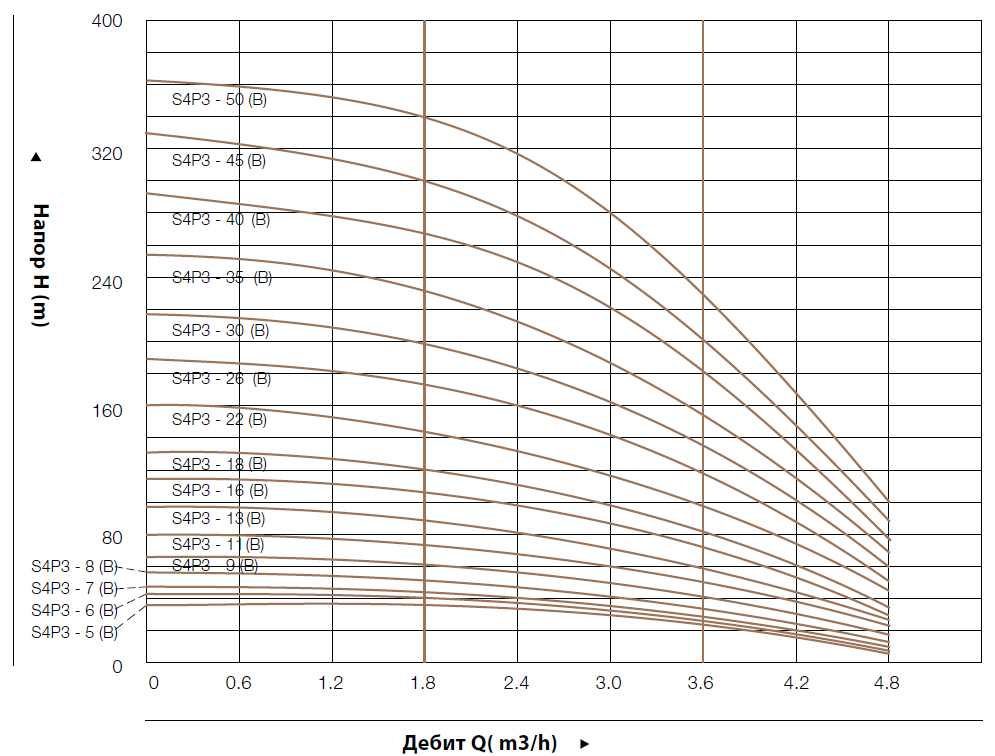 - – Работаната точка на производителността на помпите да се избира в удебелената крива, за избягване на прегряване или претоварване на мотора.