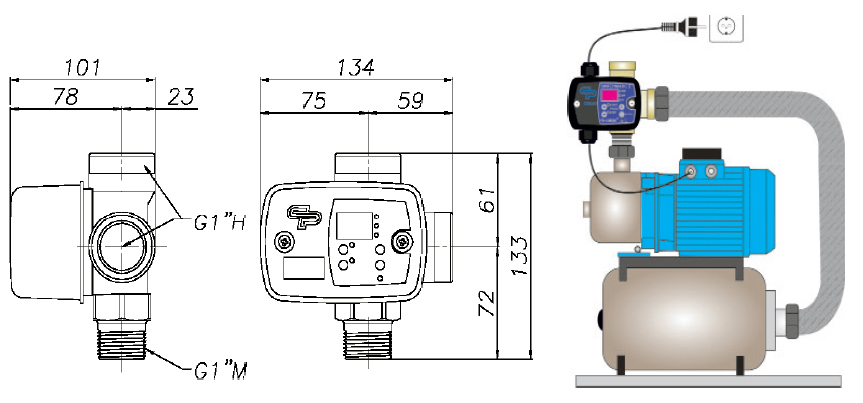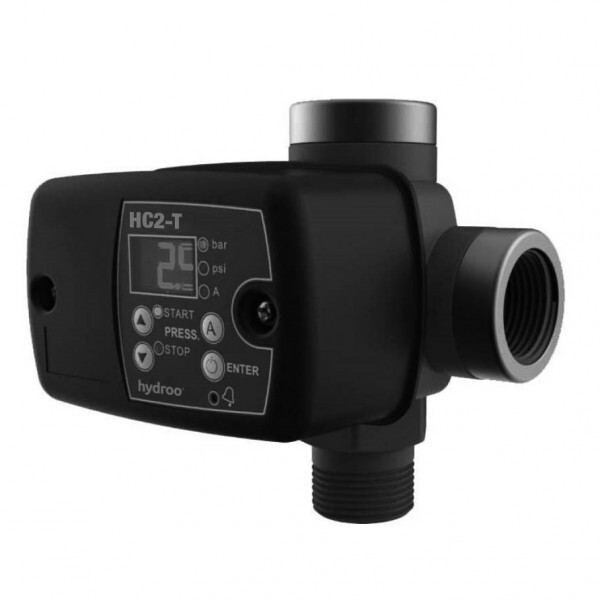 Електроният пресостат Hydroo HC2-Т за налягане с цифров манометър интегриран в 3-пътна връзка с възвратен клапан. Моделът HC2-Т може да управлява пускането и спирането на монофазни помпи с електродвигатели до 2,2 kW. Стартиращото и изключващото налягане може да се настрои лесно и точно чрез удобен за потребителя контролен панел. Окабеляването се извършва по същия начин, както конвенционалния електромеханичен превключвател. Гарантира пълна защита на помпата.