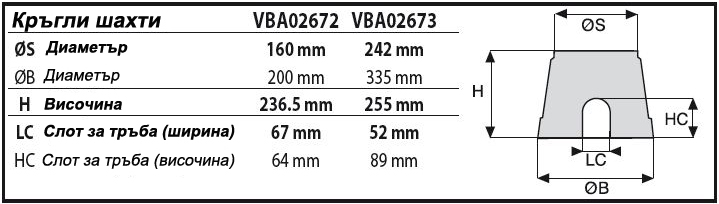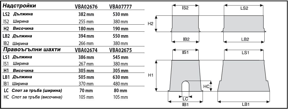 - VBA02674C и VBA02675C: Капаци за шахти модели VBA02674 и VBA02675 и за надстройки модели VBA02676 и VBA07777