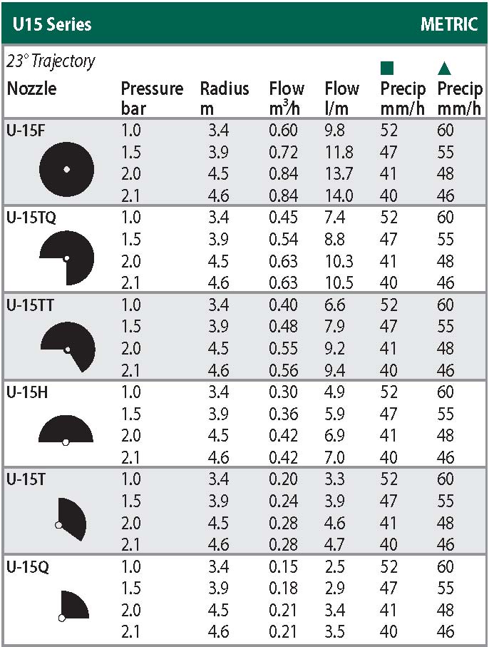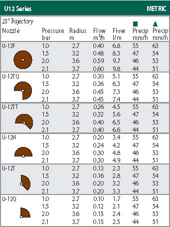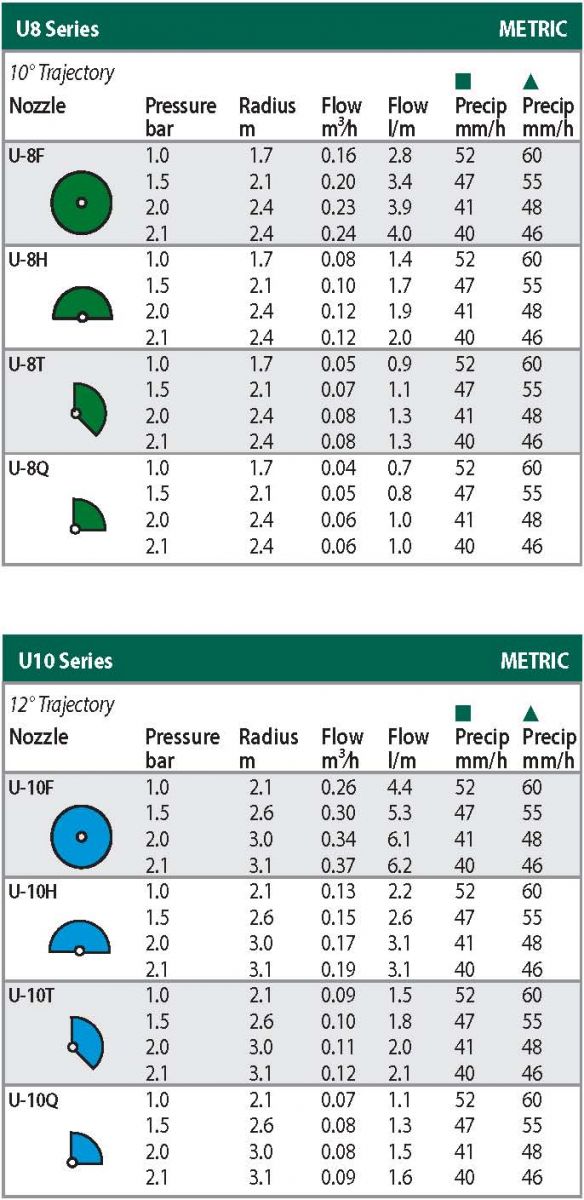* Когато дюзите от серия U с два отвора са инсталирани вместо стандартни дюзи на всеки разпръсквач тип "спрей" на всяка поливна зона. Резултатите могат да варират въз основа на специфичните условия на площите, като разстояние между разпръсквачите, вятър, температура, тип почва и вид трева. Коефициента на планиране (SC) измерва ефективността на разпръсквачите. Той измерва колко повече трябва да поливате цялата площ, за да получават достатъчно вода най-сухите места. Колкото стойността е по-ниска, толкова по-добре разпръсквачите разпределят водата.