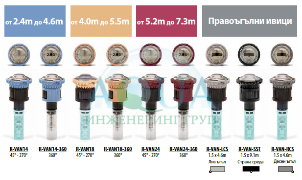 R-VAN притежават плътни водни струи с големи водни капчици прорязващи вятъра, за да доставят вода, където искате. R-VAN се използват по-лесно благодарение на ръчно регулируемият сектор и радиус. R-VAN са с 23% ценово предимство и изискват малки складови наличности, за да постигнат покритие от 45 ° до 360 ° спрямо водещата конкурентна марка.
