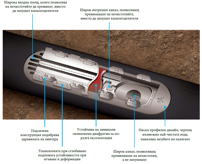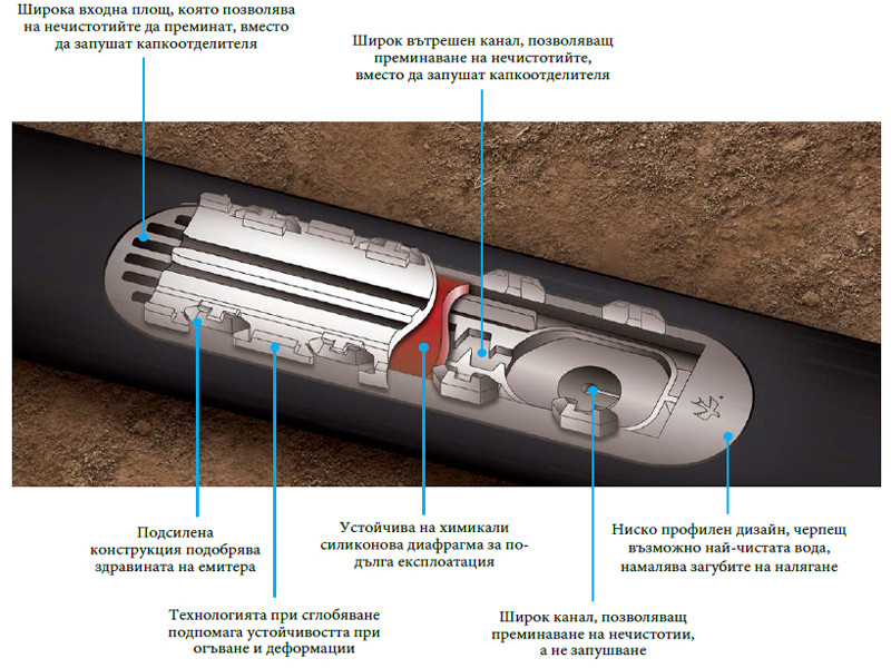 - Устойчивия на запушване капкообразувател гарантира, че водата ще се достави до растението, без значение дали черпите вода от сондажен кладенец, язовир или канал;