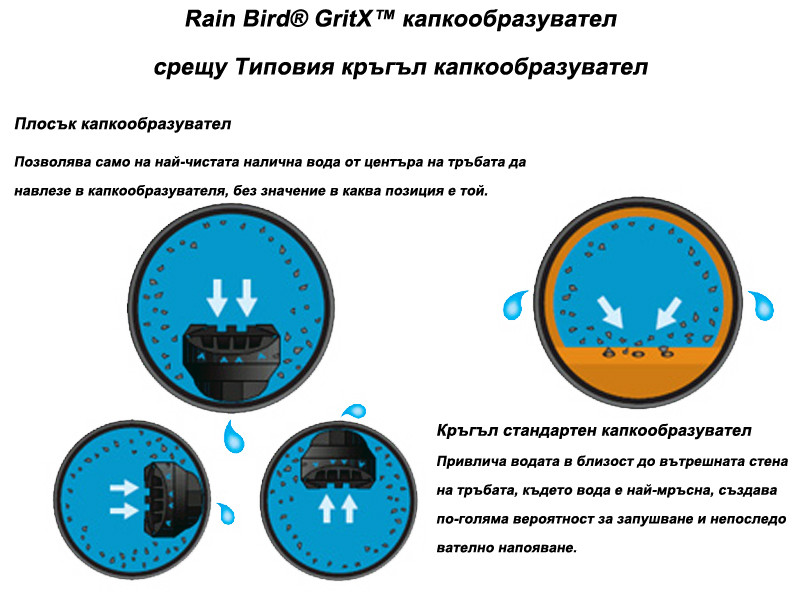 Rain Bird® GritX™ капкообразувател срещу Типовия кръгъл капкообразувател