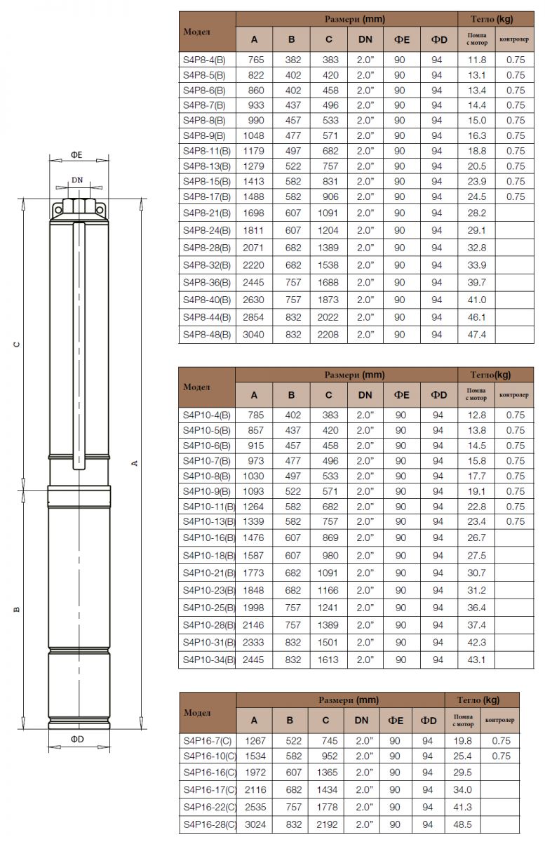 3,5" и 4" потопяеми сондажни многостъпални помпи. Корпус от неръждаема стомана SS304. Работни колела и дифузор изработени от POM (Полиоксиметилен).
