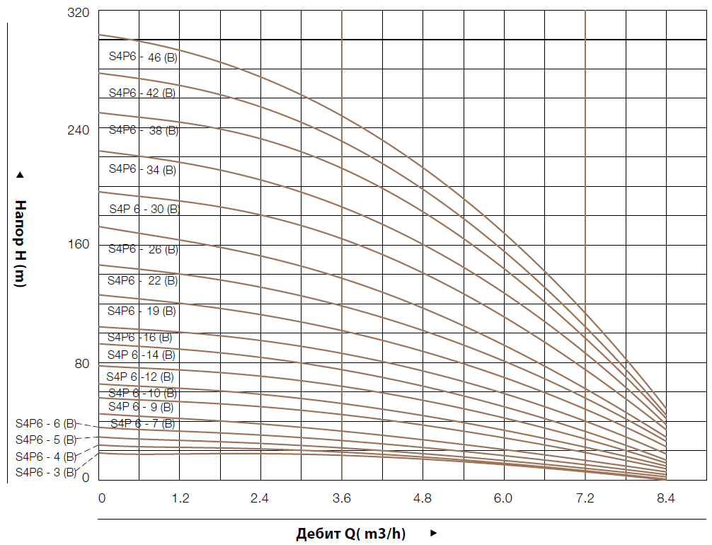 - – Работаната точка на производителността на помпите да се избира в удебелената крива, за избягване на прегряване или претоварване на мотора.