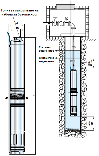 - Максимална дълбочина на потапяне на захранващия кабел до 60 м