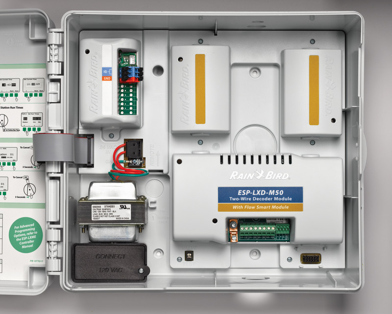 С всеки програматор ESP-LXD стандартно е включен модул ESP-LXD-M50-станции, който се инсталира на специален слот в кутията на програматора. Модулът ESP-LXD-M50 има клеми за свързване на 2-проводните кабелни трасета. Във всеки модул е интегриран Rain Bird Flow Smart софтуер за управление на дебита в системата - просто закачете от 1 до 5 SD-210 сензор декодери и сензори за дебит (не са включени) към декодерното кабелно трасе, и програматора ще направи останалото.