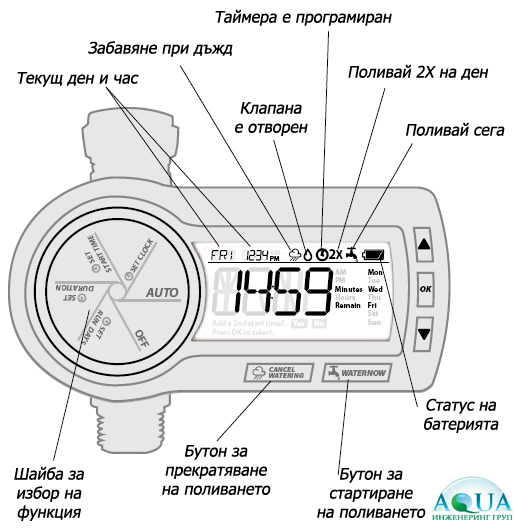 - Отделни бутони за (мигновенно прекратяване на поливането) и (ръчно стартиране)