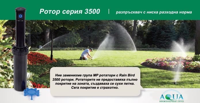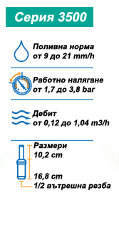 Роторен разпръсквач с малък до среден радиус серия 3504 са лесни за използване при малки до средни радиуси с 1/2 " присъединителна вътрешна резба и роторен механизъм смазван с вода. Серията е с приложение за дъждуване на тревни площи с радиус до 10,7m. Чрез плоска отвертка разпръсквача коригира сектора на поливане бързо и лесно. Роторът се предлага в комплект с шест превъзходни дюзи с технология на разпръскване на водата Rain Curtain и удобството от реверсивното пълнокръгово и секторно действие (до 360 градуса). Освен това, възможности за лесна подмяна на дюзата и изваждане на филтърния екран прави поддръжката удобна и приятна. Всичко това, на достъпна цена и 3-годишна фабрична гаранция.