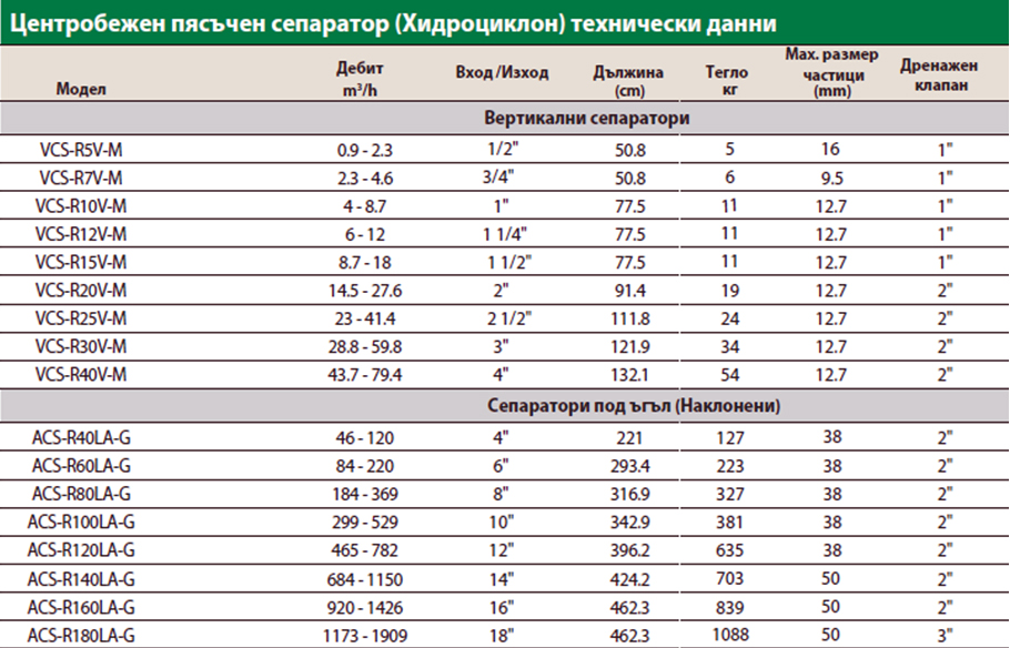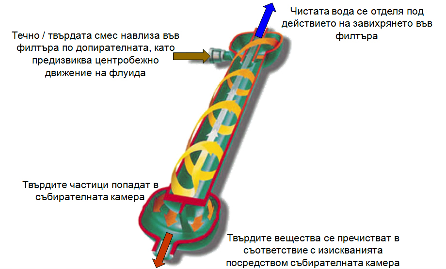 - Пясъчните частици се отделят центробежно при пълен дебит, без движещи се части.